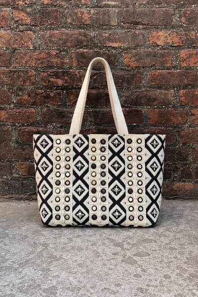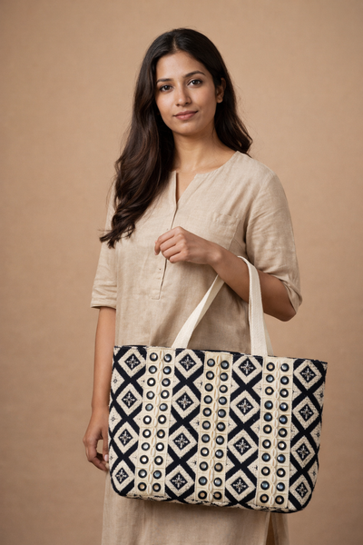 • Size: 14 x 12 x 6 inches • Material: Durable canvas fabric • Hand embroidered, ethically handcrafted in India • Non-detachable cotton handles for comfortable carry
